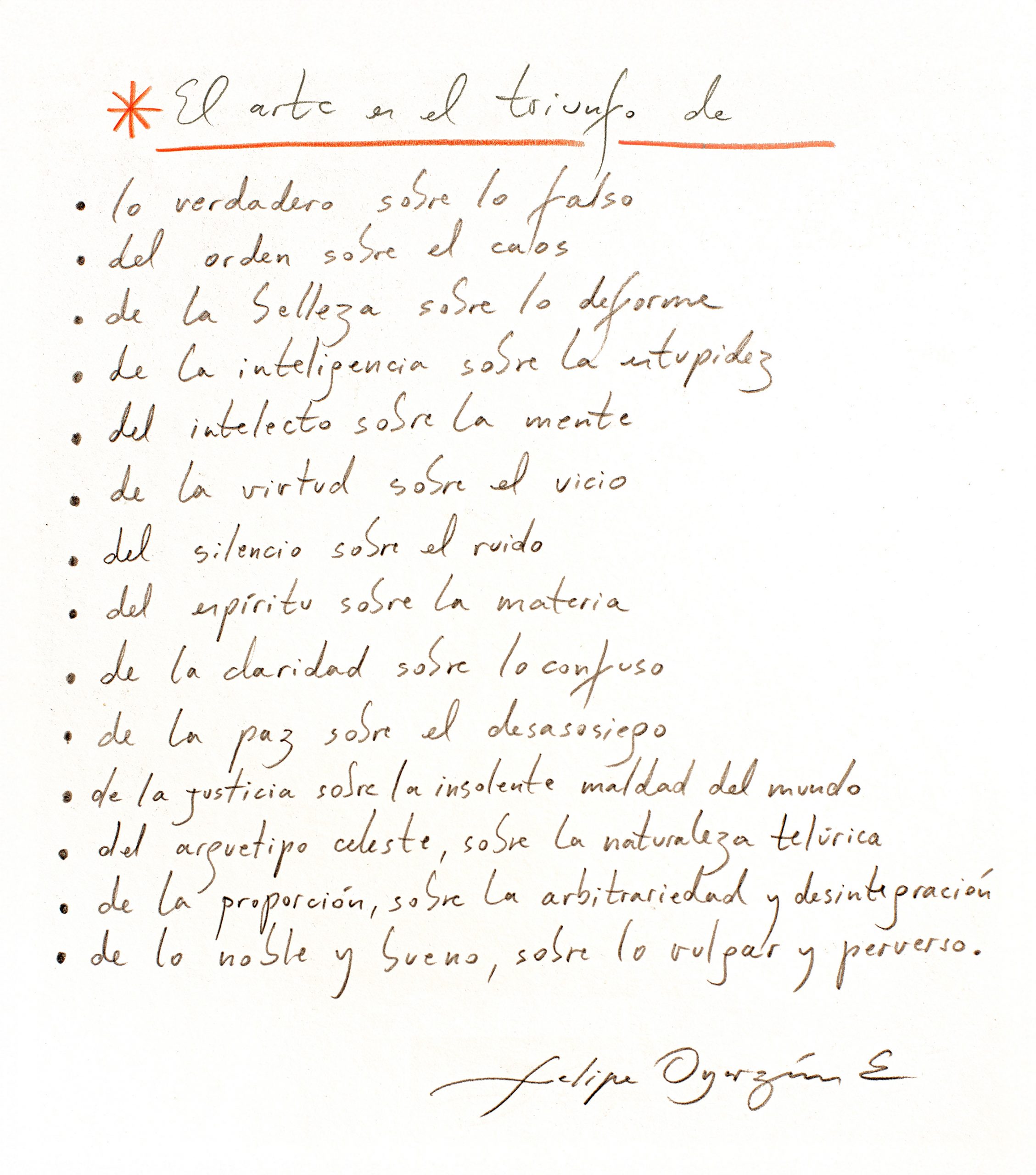 “La abstracción geométrica implica ordenar el caos; elevarse del devenir material, al ser espiritual; traer al espectro visible, lo primigenio y fundamento de lo real. De tal manera, mi trabajo es el encuentro de elementos esenciales, aquetípicos y simbólicos, que permitan vincular la vida humana terrestre, con su origen divino, anterior a la caída.”